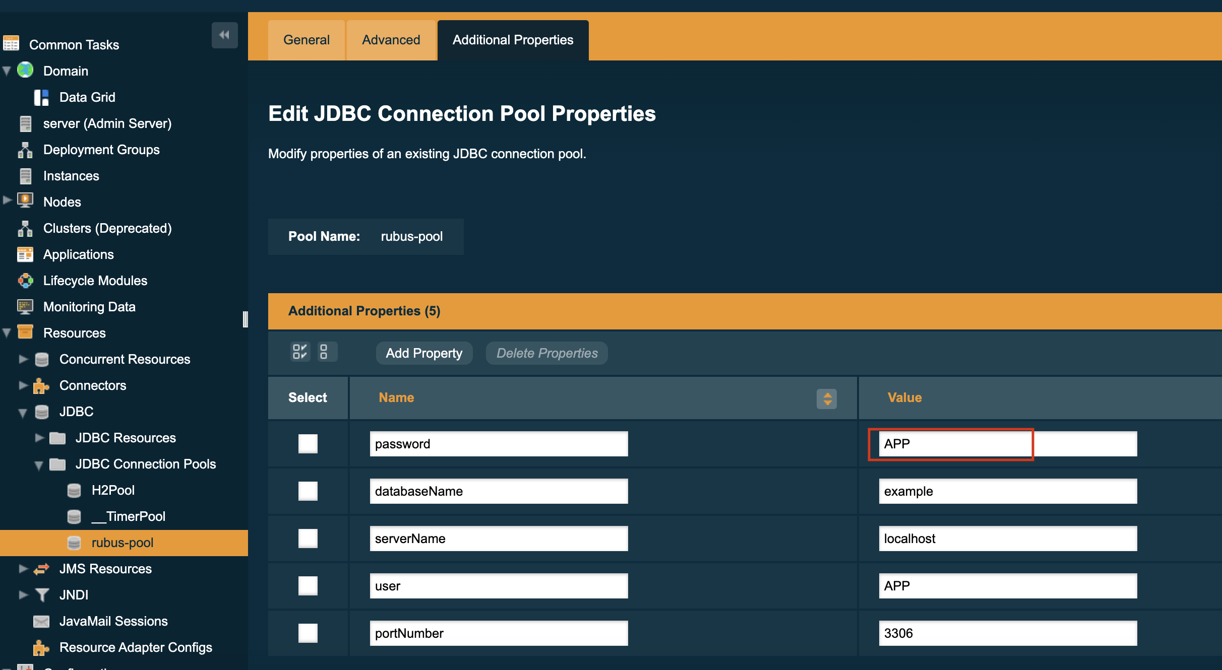 Here is an example of setting the user’s password for a JDBC connection pool:
